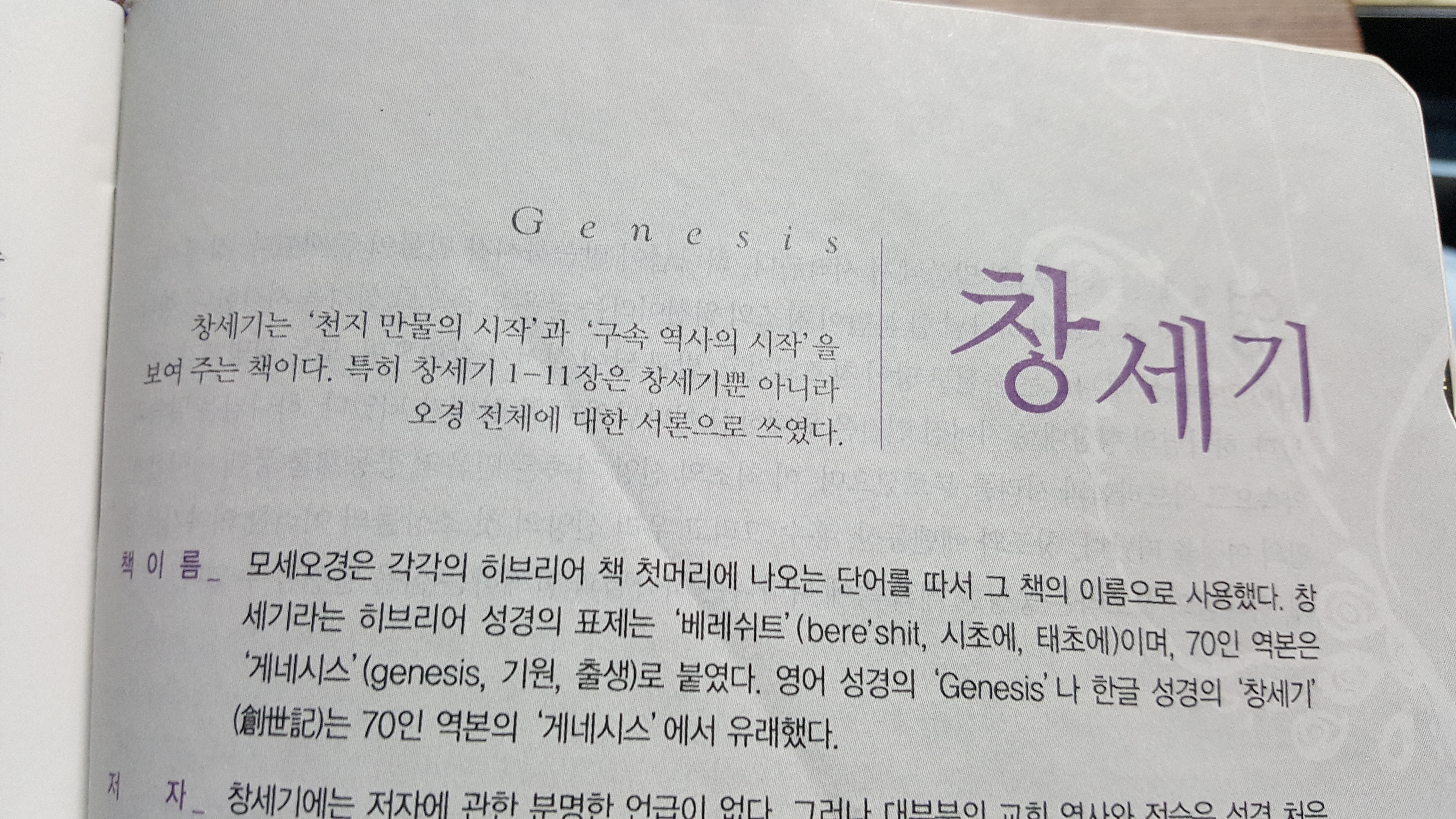- 70인경 헬라어 성경 제목 : ΓΕΝΕΣΙΣ(제네시스, 기원, 출처, 창조)